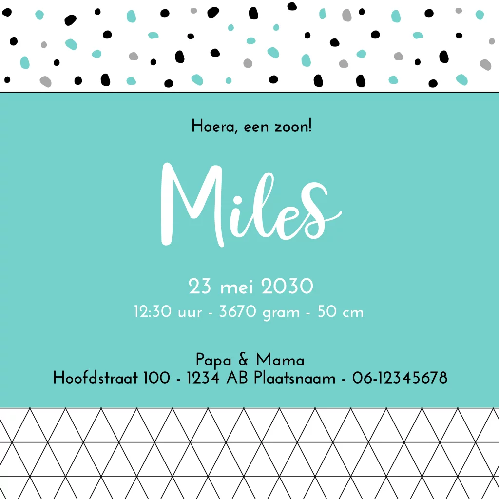 Lief geboortekaartje voor jongen met stipjes driehoekje en konijntje