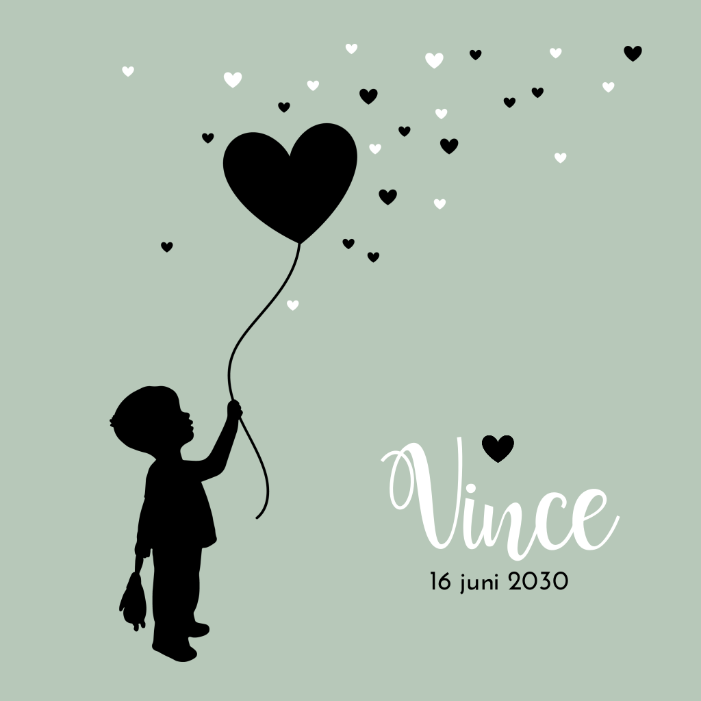 Lieve silhouet geboortekaartje jongen met groen hartjes ballon