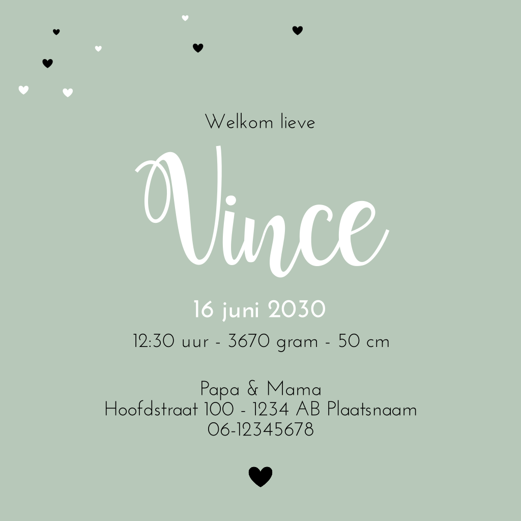 Schattige geboortekaart voor je zoontje met een hip silhouet van een jongetje die een hartjes ballon vasthoud op een achtergrond van legergroen met een hartjes patroon. Pas de kleuren en teksten aan in de editor.