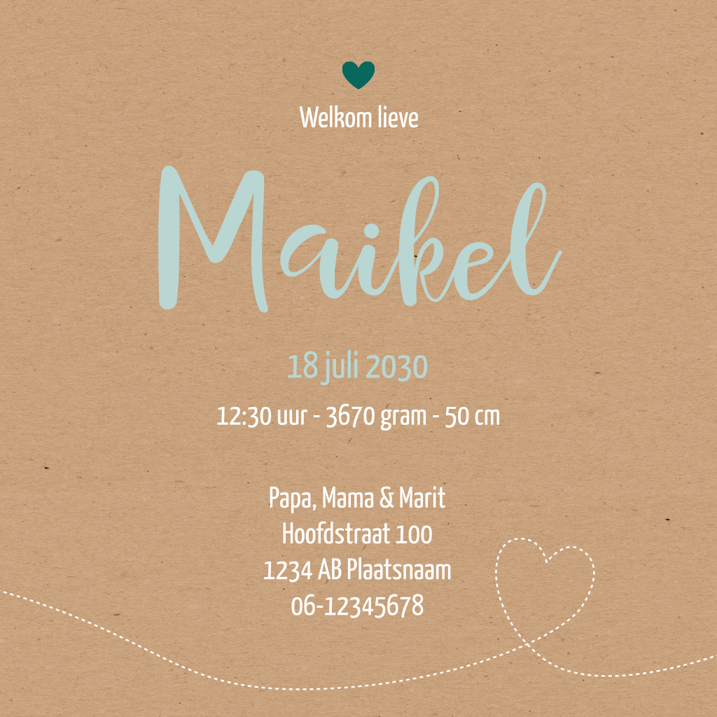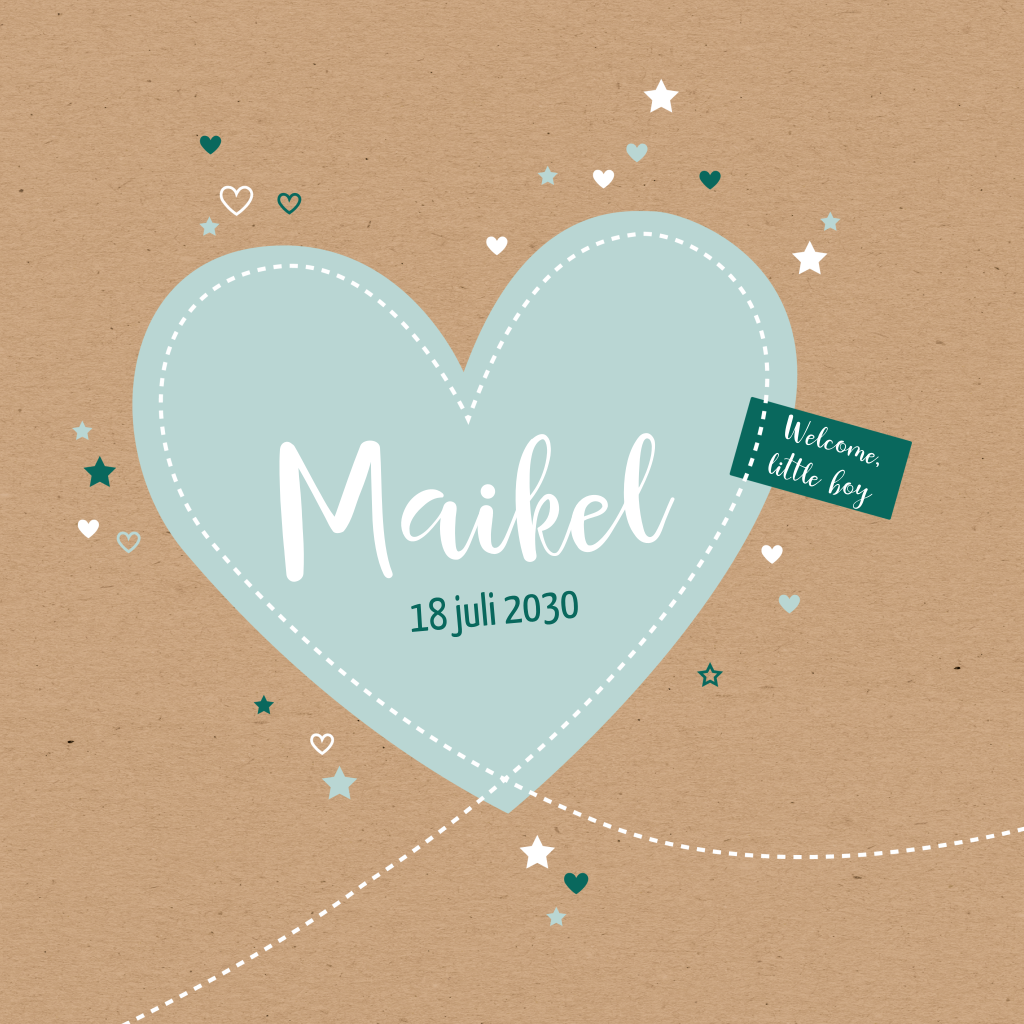 Lieve geboortekaart voor je zoontje met blauw hart op kraft achtergrond met daar omheen kleine hartjes en sterretjes. Pas de kleuren en teksten aan naar wens in de editor om de kaart persoonlijk te maken.