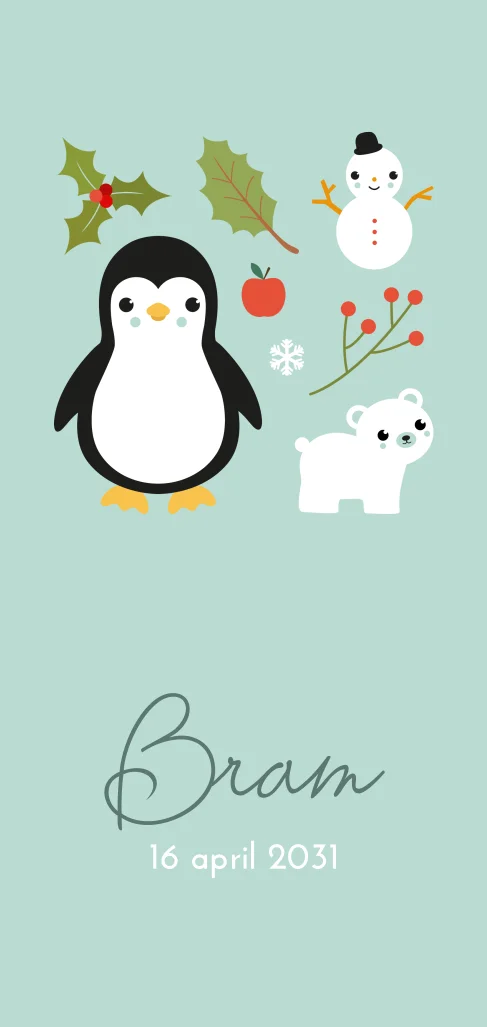 Unieke geboortekaart voor je zoontje die rond kerst geboren wordt. Met schattige illustraties van een pinguïntje, ijsbeertje, sneeuwpop en kersttakjes in dit echt een originele geboortekaart!