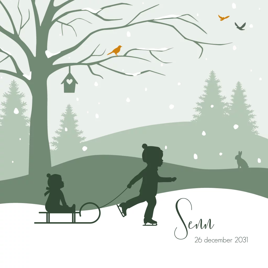 Kondig de geboorte van jullie zoon en broertje aan met dit winterse kaartje in groentinten. Een grote broer is aan het schaatsen en trekt zijn kleine broertje op een slee voort. Het kaartje kan helemaal naar wens aangepast worden in onze online editor.