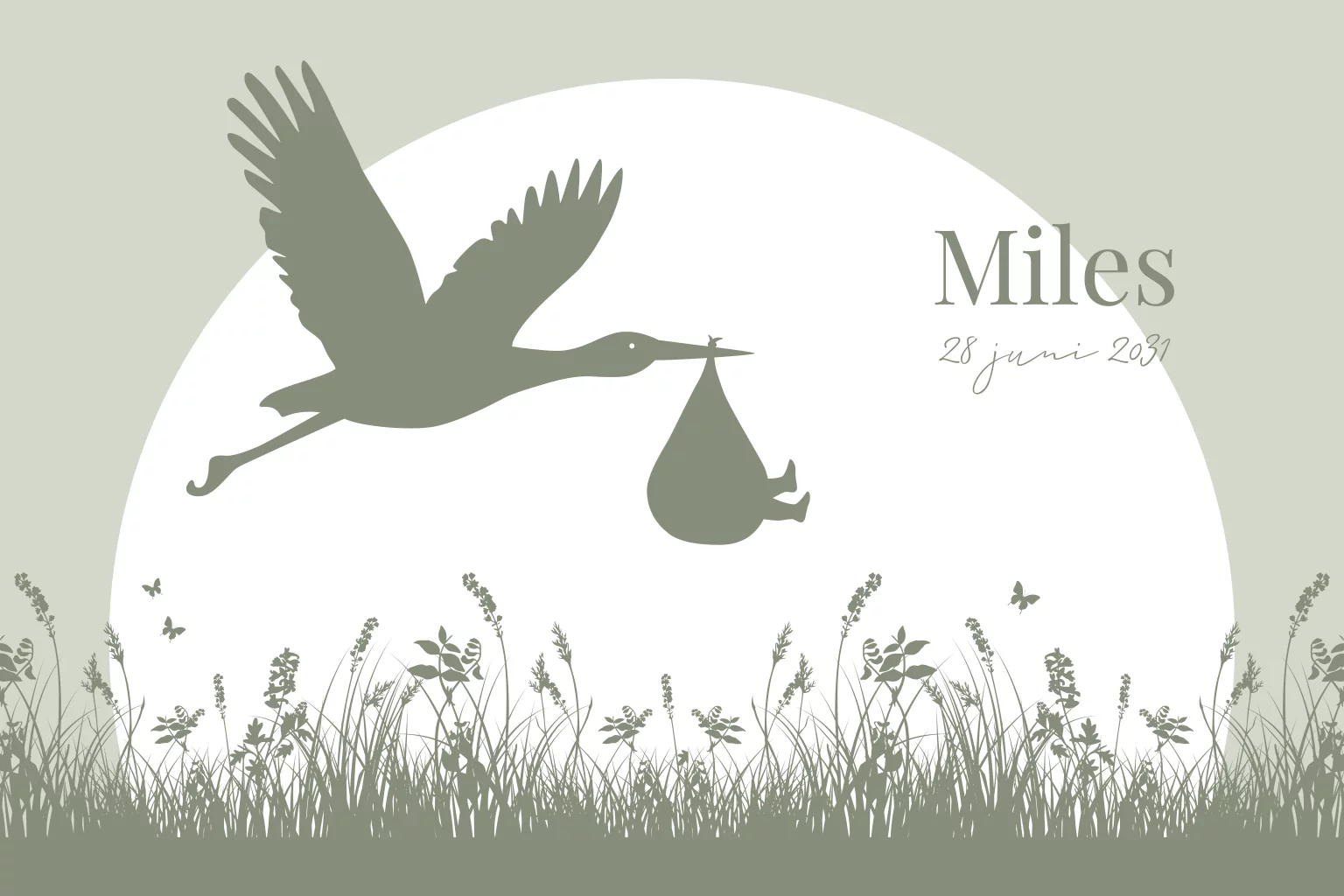 Een liggend geboortekaartje voor jouw zoontje. Het kaartje heeft verschillende groene kleuren met een silhouetje van een ooievaar met baby. Pas het ontwerp naar wens aan in onze online editor.