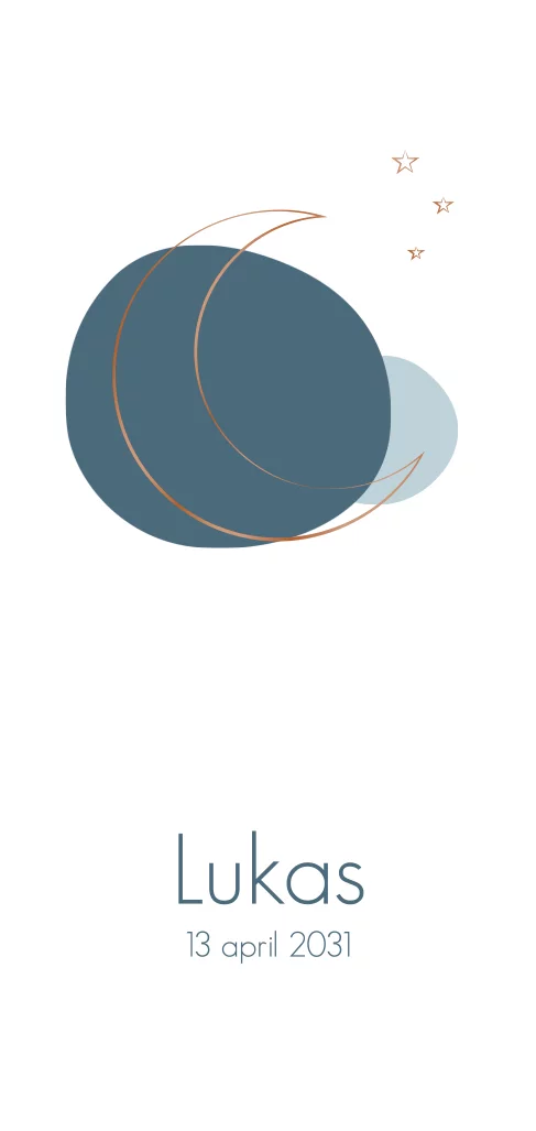 Kondig de geboorte van jullie zoontje aan met deze mooie kaart. Op de kaart zijn twee ronde vlakken in blauwtint te zien. De maan en drie sterren worden gedrukt in hoogglans. Bestel snel een proefdruk om dit kaartje in het echt te zien!