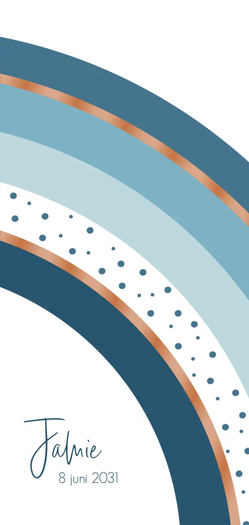 Een langwerpig geboortekaartje voor de geboorte van een jongen. Het kaartje heeft een sierlijke regenboog in verschillende kleuren blauw en lijnen die in hoogglans worden gedrukt. De binnenkant van de kaart is donkerblauw waar de naam van jullie kindje ook in hoogglans wordt gedrukt. Verander de naam van het kaartje naar de naam van jullie kindje in onze editor.