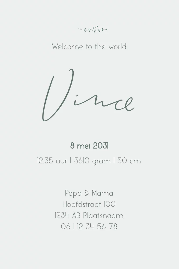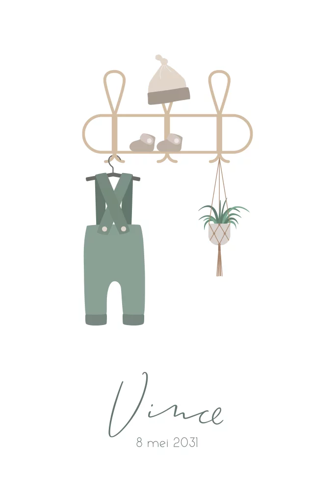 Wat een lief geboortekaartje voor een jongen. Het kaartje heeft een witte achtergrond met een kapstokje, plantje en keertjes. Het tuinbroekje en de naam hebben een groene kleur. Onder de illustraties is er ruimte voor de naam en geboortedatum van jouw zoon.