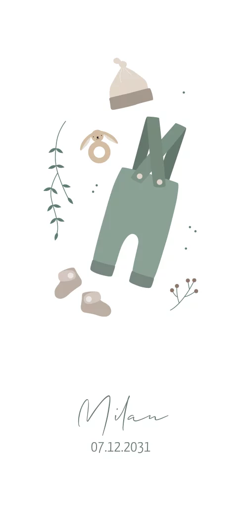 Een schattig, langwerpig geboortekaartje voor een jongen. Je ziet verschillende illustraties van een broekje, mutsje, slofjes en rammelaar in groene tinten. Onder de illustraties is er ruimte voor de naam van jouw zoon.