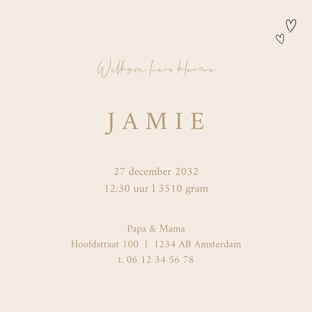 Een lief geboortekaartje voor jullie zoon. Centraal op het kaartje staat een lijntekening van een jongetje met een knuffel. De lichte achtergrond geeft het kaartje een zachte uitstraling. Maak het kaartje helemaal naar wens in onze online editor! Bestel snel een proefdruk om dit kaartje in het echt te bewonderen!