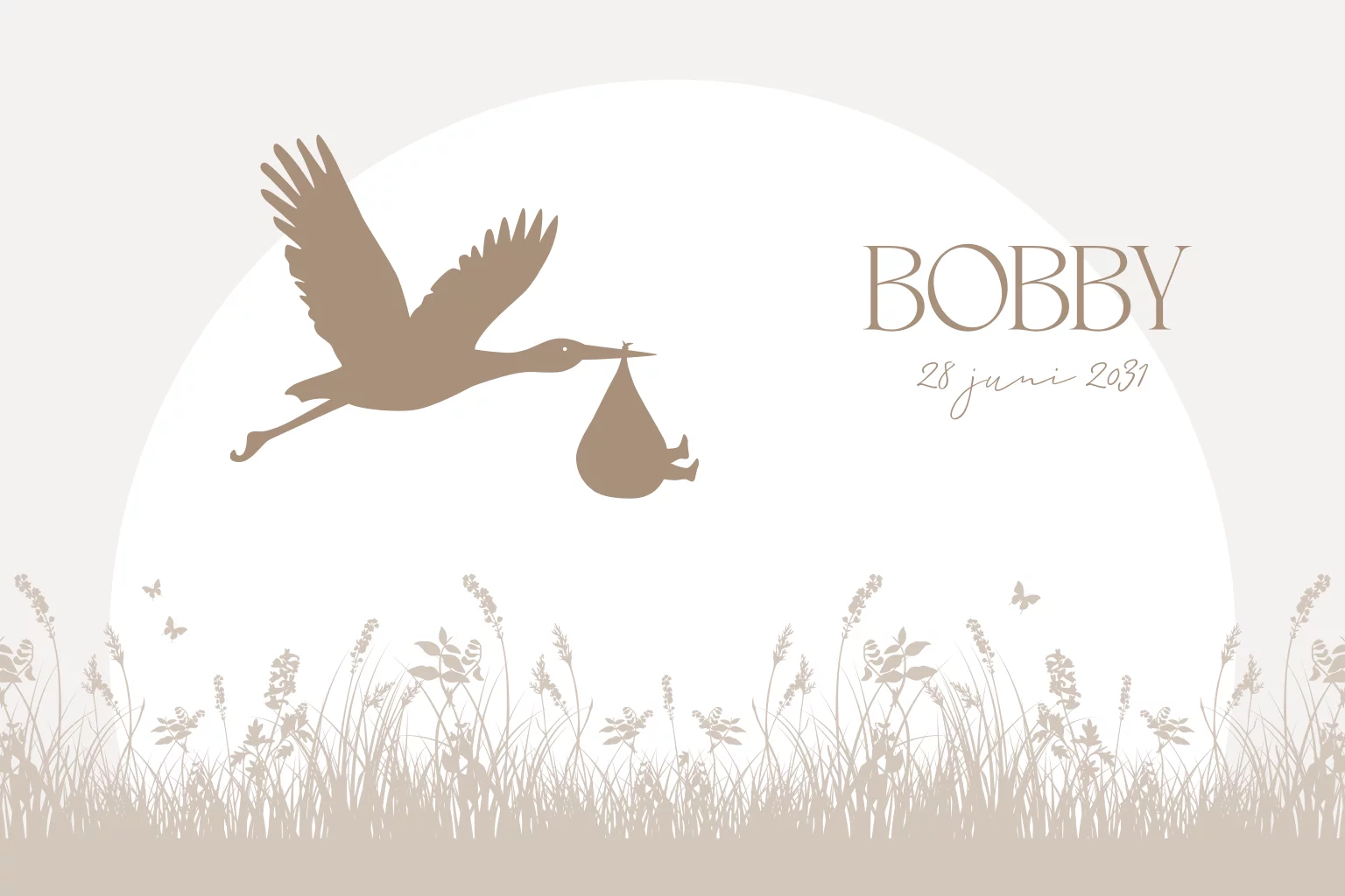 Een lief en stijlvol geboortekaartje voor jouw kindje. Het kaartje heeft verschillende beige tinten met een silhouetje van een ooievaar met baby. Pas het ontwerp naar wens aan in onze online editor.