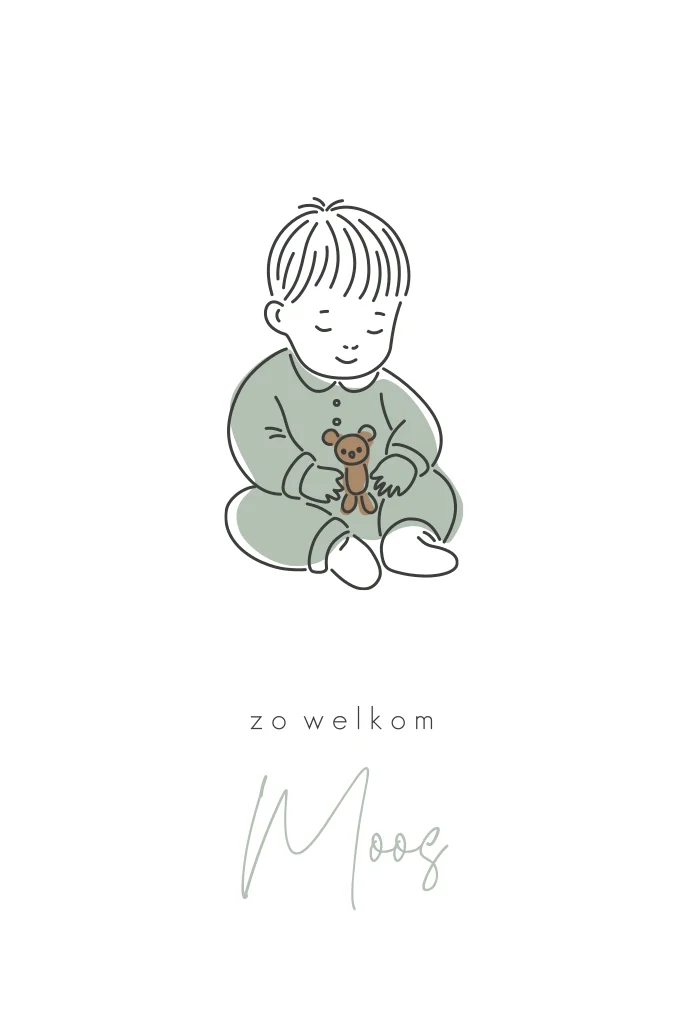 Een lief kaartje voor de geboorte van jullie zoon. Op het eenvoudige kaartje staat een lijntekening van een jongetje met een knuffel, schattig! Pas het kaartje naar wens aan in onze online editor. Bestel snel een proefdruk om dit kaartje in het echt te bewonderen!