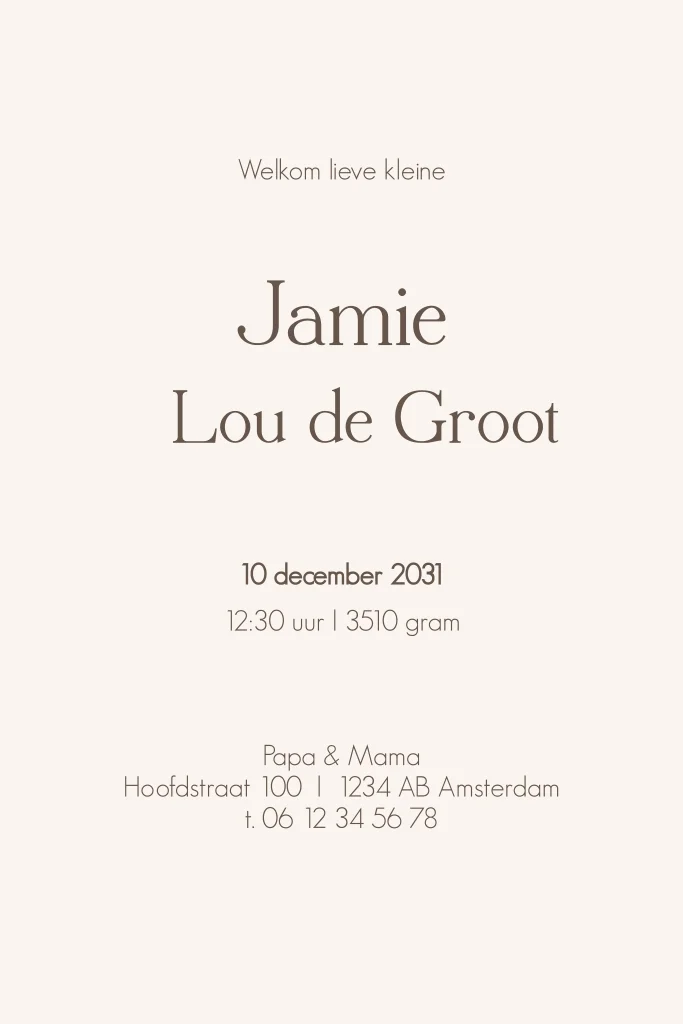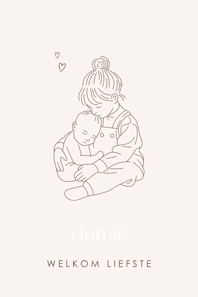 Mooi neutraal geboortekaartje voor een jongen of meisje met lijntekening van baby met grote zus. Pas het ontwerp naar wens zelf aan.Plaats zelf de teksten en elementen eenvoudig op de juiste plek in onze opmaaktool. Heb je hier hulp bij nodig? Neem gerust even contact met ons op!