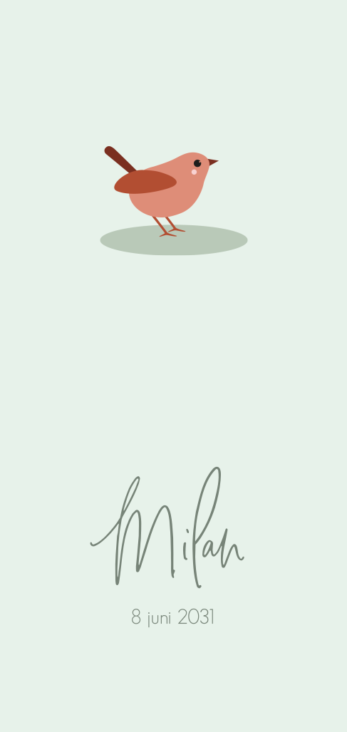 Lief geboortekaartje voor een jongen met eenvoudig vogeltje. Het kaartje heeft een mintgroene achtergrond. Het kaartje is volledig te personaliseren in onze online editor.