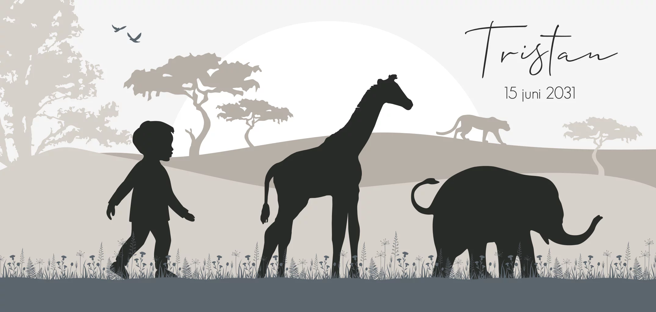 Een panorama geboortekaartje voor een jongen. Het kaartje heeft blauwe tinten met daarop een silhouetje van een jongen met olifant en giraffe. Het geboortekaartje is naar wens aan te passen in onze editor.