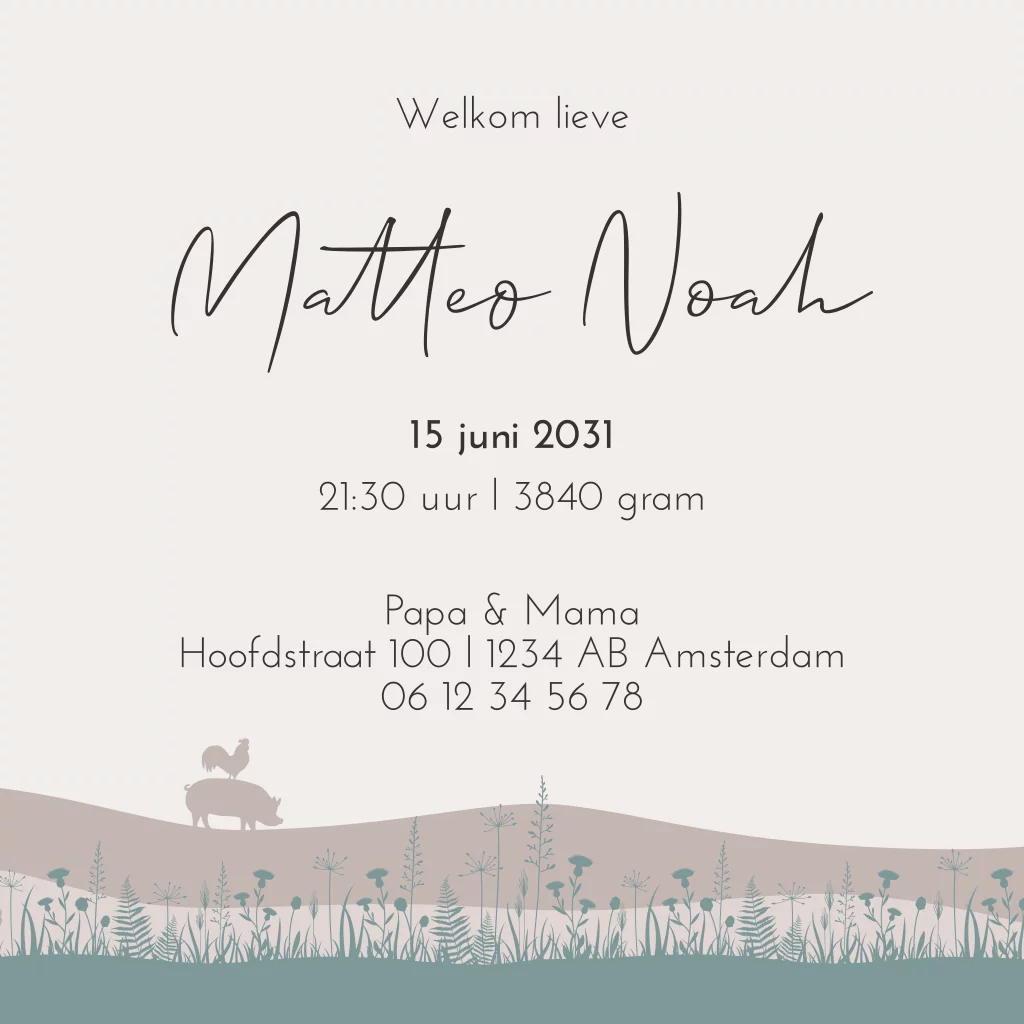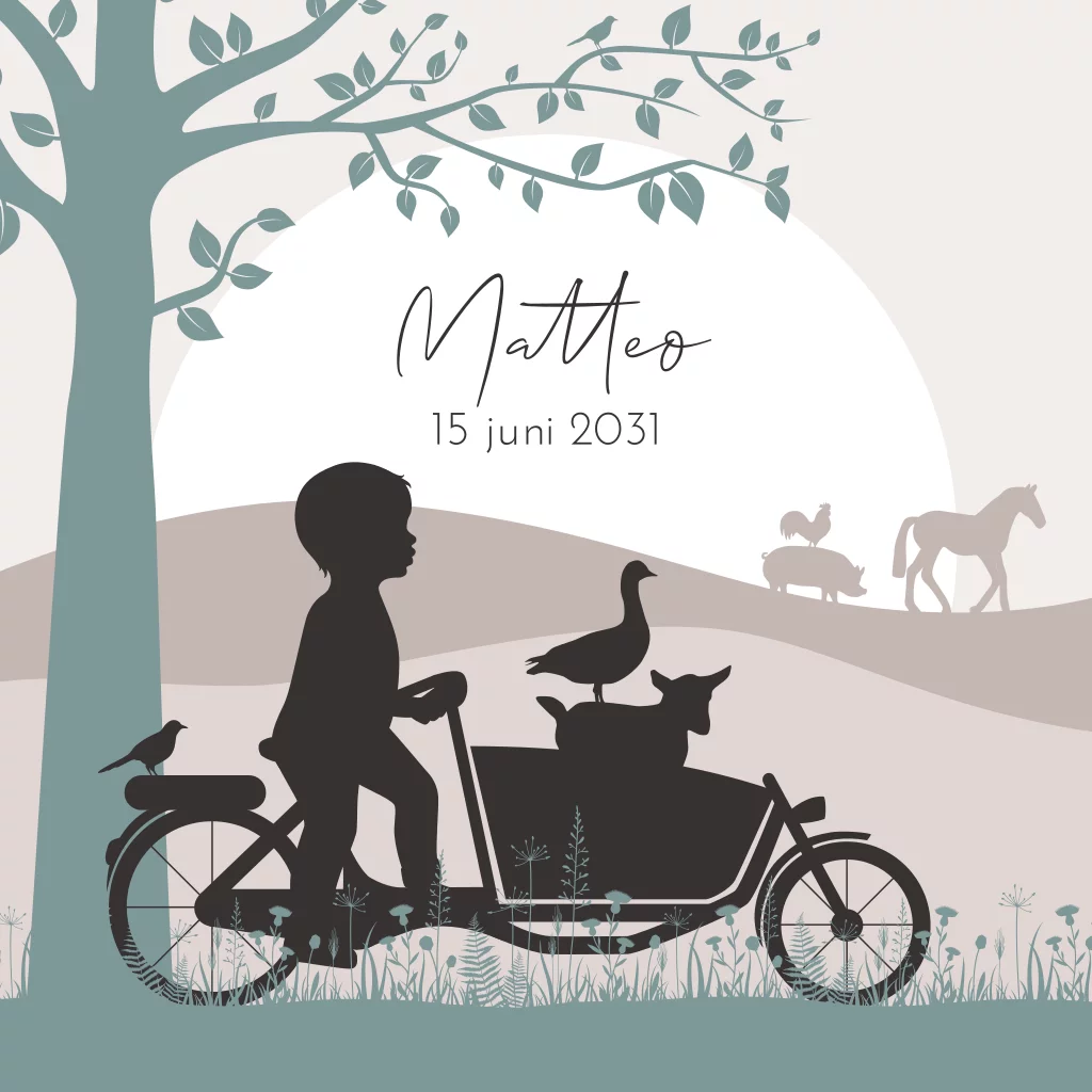 Een lief silhouet geboortekaartje voor jouw zoontje. Het kaartje heeft een silhouetje van een jongetje op de fiets met boerderijdieren. Het geboortekaartje heeft een petrol kleur. Pas het ontwerp naar wens aan.