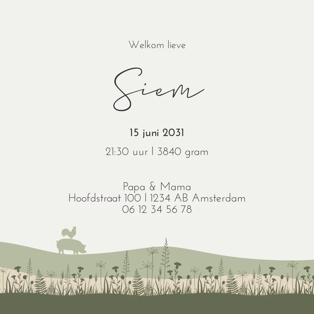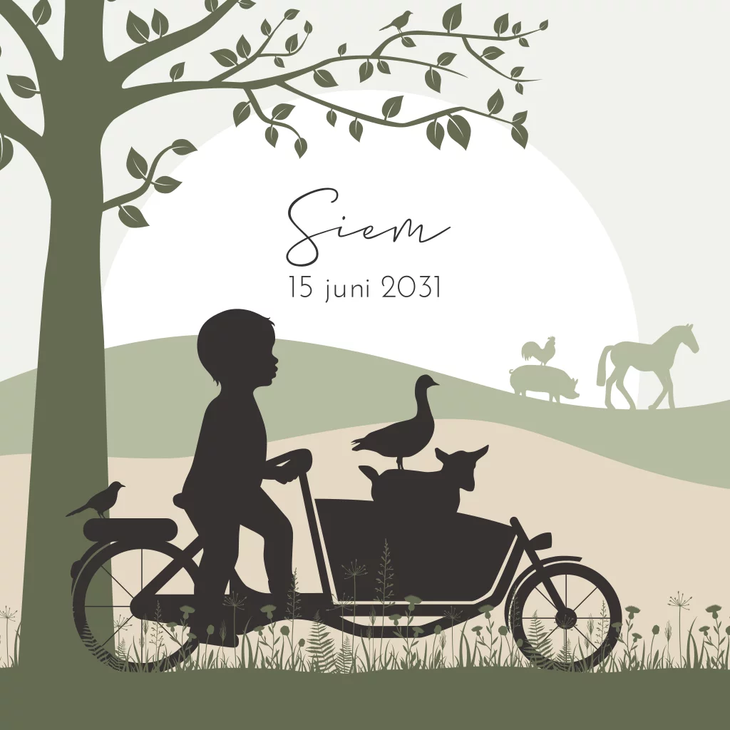 Een lief geboortekaartje met boerderij thema voor jouw zoontje. Het kaartje heeft groene tinten met daarop schattige illustraties van een silhouetje op de fiets. In de bakfiets en in de verte zie je verschillende boerderij dieren.