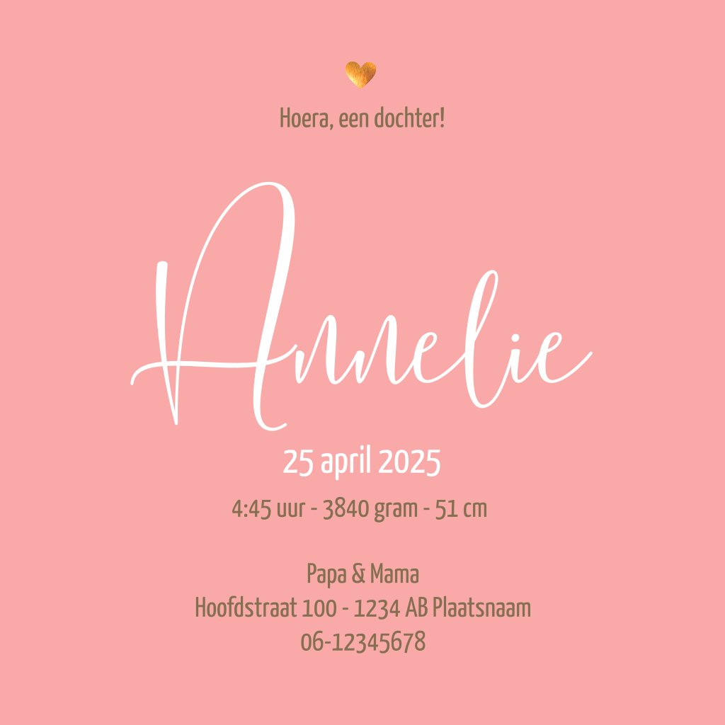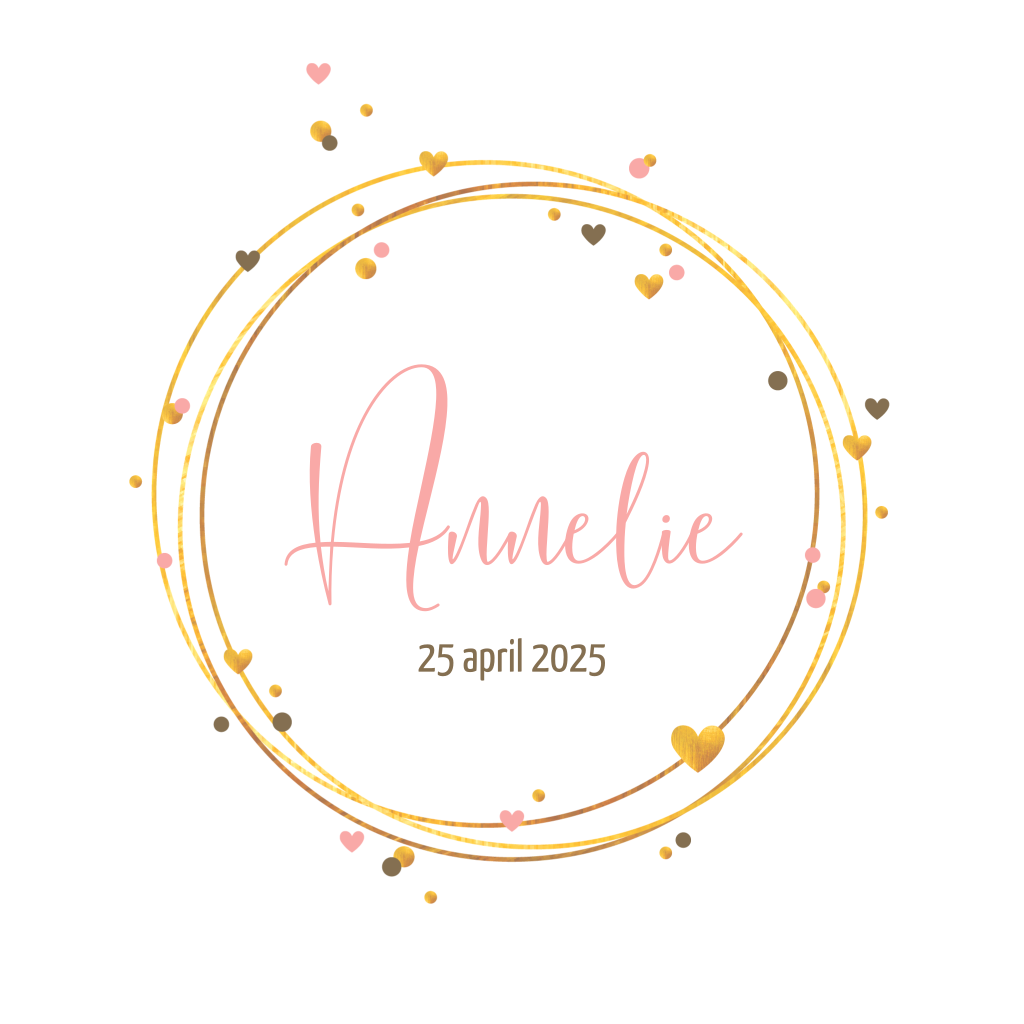 Stijlvolle geboortekaart met cirkels, hartjes en confetti in goudlook, roze en bruin. Teksten en lettertypes zijn naar wens aan te passen. Leuk voor een meisje!