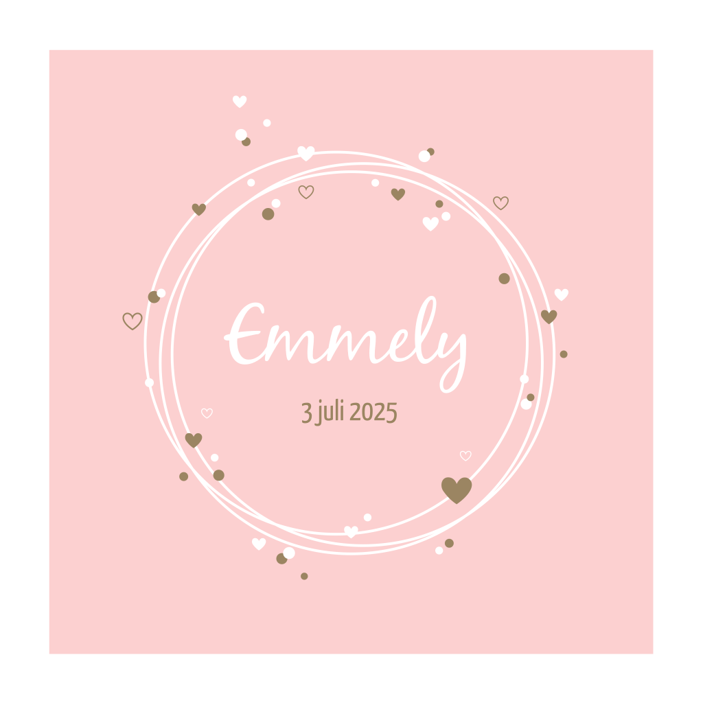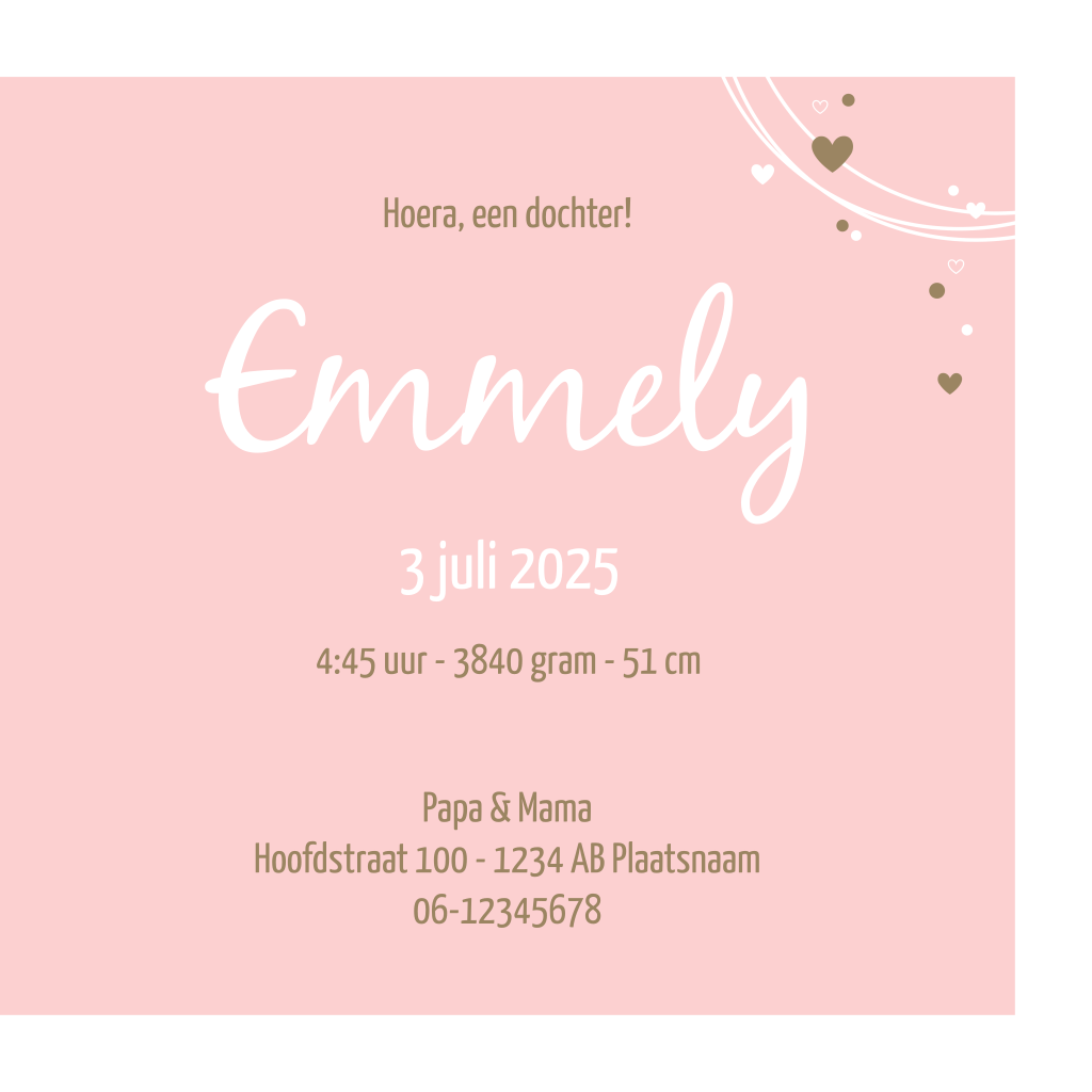 Een strak geboortekaartje in roze met een witte rand. Leuk zijn de cirkels om de naam en de kleine hartjes. Kleuren en lettertypes zijn naar wens aan te passen! Iets voor jouw dochter?