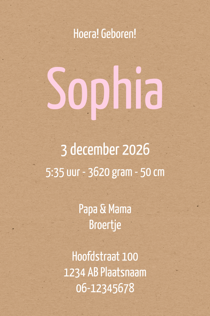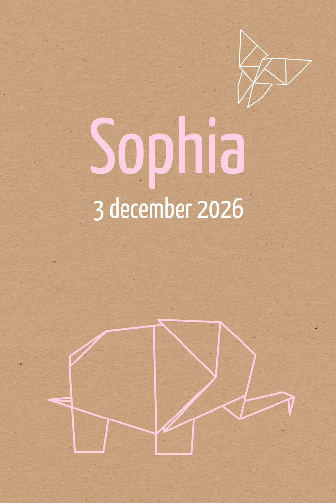 Geboortekaartje voor een dochter met olifantje en vlinder in origami stijl op een kraft achtergrond. Liever een andere kleur? Alles is mogelijk!