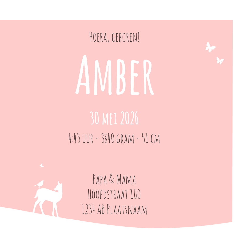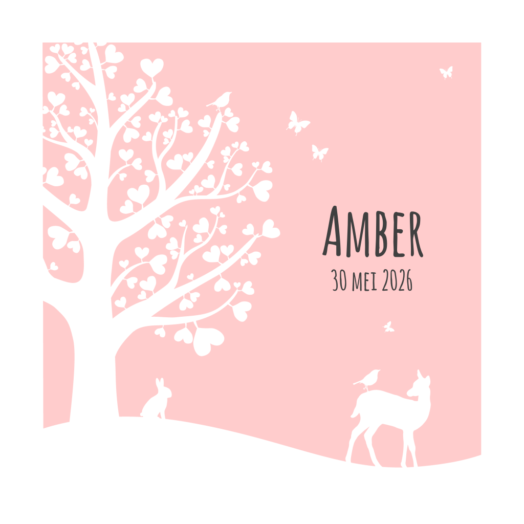 Lief geboortekaartje met een silhouet afbeelding van een hartjesboom. De dieren op dit babykaartje maken het een vrolijk geheel. Helemaal leuk voor de geboorte van jullie kleine meisje. Liever een andere achtergrondkleur? Dat kan! In het menu rechts vind je deze optie.