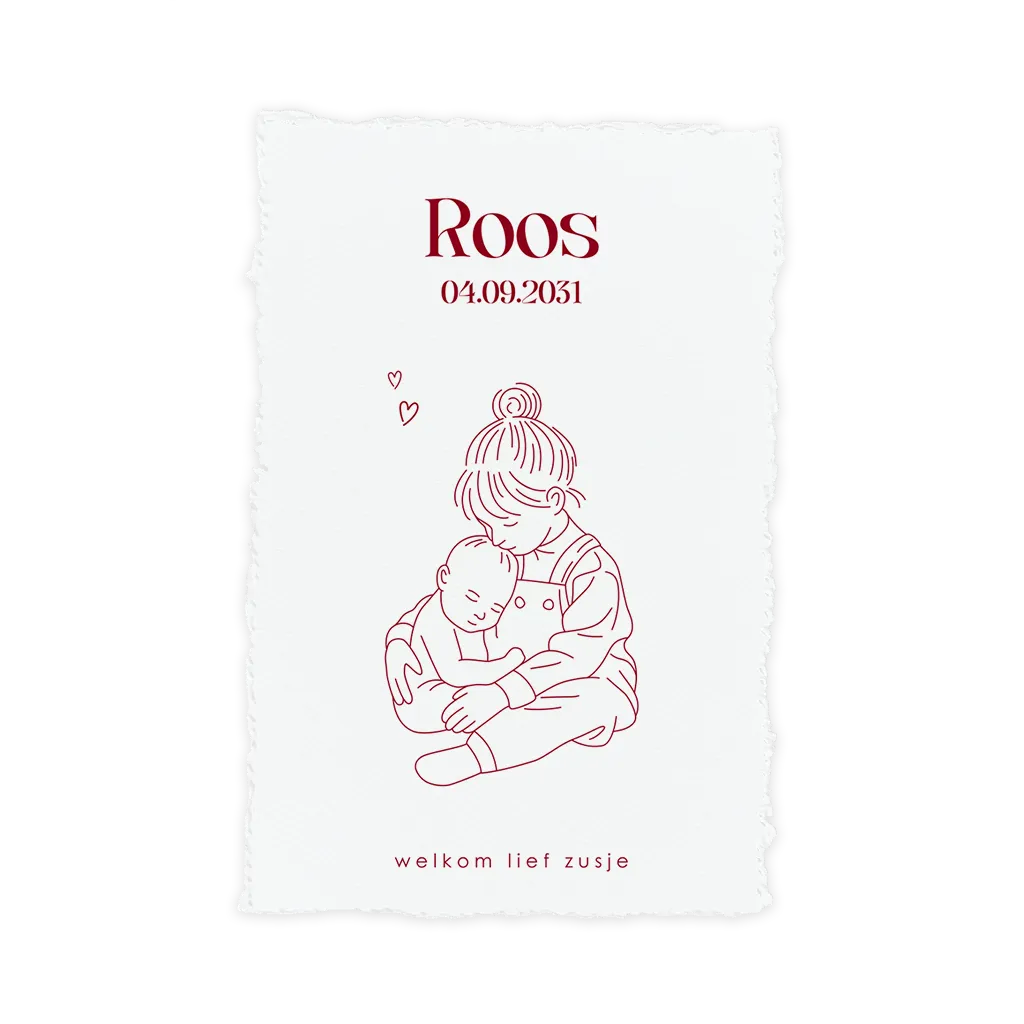 Wat een schattig geboortekaartje! Het kaartje heeft een witte achtergrond met daarop een lijntekening van een baby met grote zus. Het kaartje heeft een geschept papier look die je zelf aan het kaartje geeft. Al onze kaartjes met handgeschept papier vind je hier. Let hierbij op de volgende dingen: