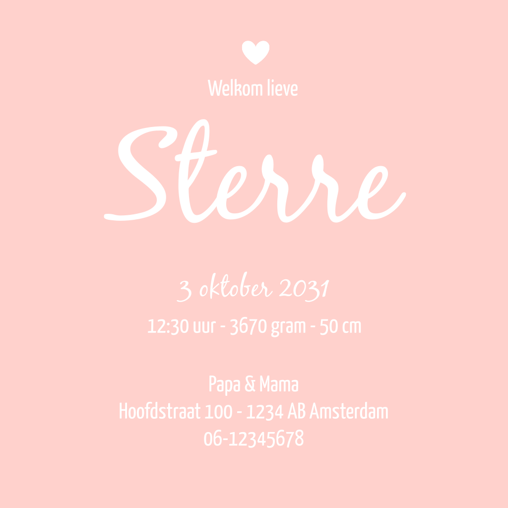 Lief geboortekaartje voor je dochter met twee grote geverfde hartjes in zacht roze. Verander de kleuren en schrijf je eigen tekst en stuur dit kaartje als geboorteaankondiging naar je vrienden en familie!