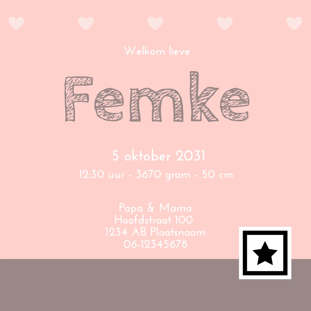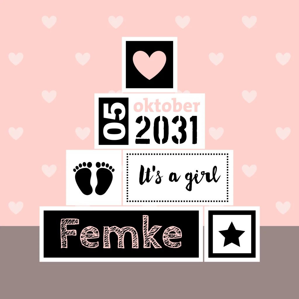 Ben je op zoek naar een lief geboortekaartje als geboorteaankondiging van je dochter? Kies dan dit kaartje! Met een lieve roze blokken toren waarop voetjes, sterretjes en een hartje staan.