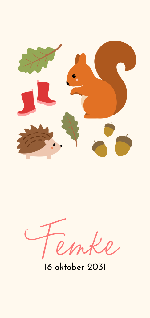 Uniek geboortekaartje voor je dochter die in de herfst geboren wordt. Met schattige illustraties van herfst blaadjes, regenlaarzen, eekhoorntje en egeltje.