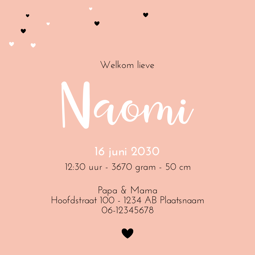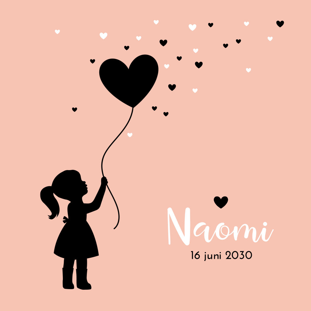 Schattig kaartje als geboorte aankondiging van je dochtertje met hippe silhouet van meisje die een hartjes ballon vasthoud op een peach kleur achtergrond. Pas de kleuren en teksten aan naar je eigen smaak in de editor.