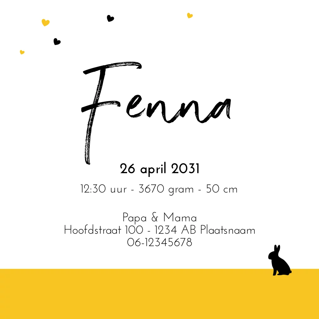 Een stoer geboortekaartje met silhouetten van een konijntje en een meisje die een paardebloem met hartjes uitblaast. Liever een andere kleur dan okergeel? Pas de kleur eenvoudig aan in de editor!
