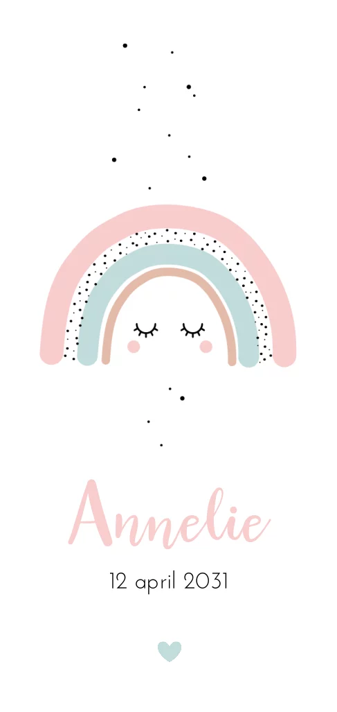 Hip geboortekaartje voor een meisje met regenboog en gezichtje