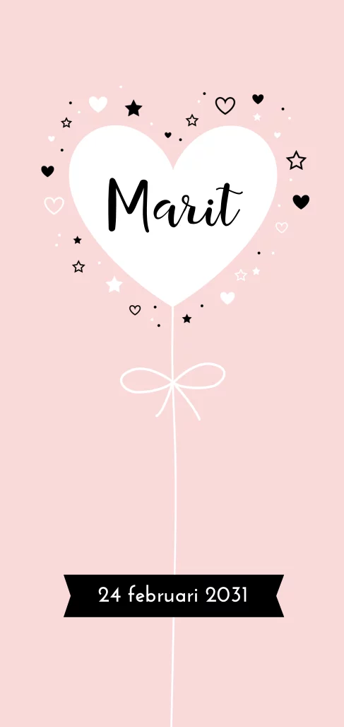 Schattig geboortekaartje voor je dochter met een lieve hartjes ballon met een strikje op een zacht roze achtergrond.