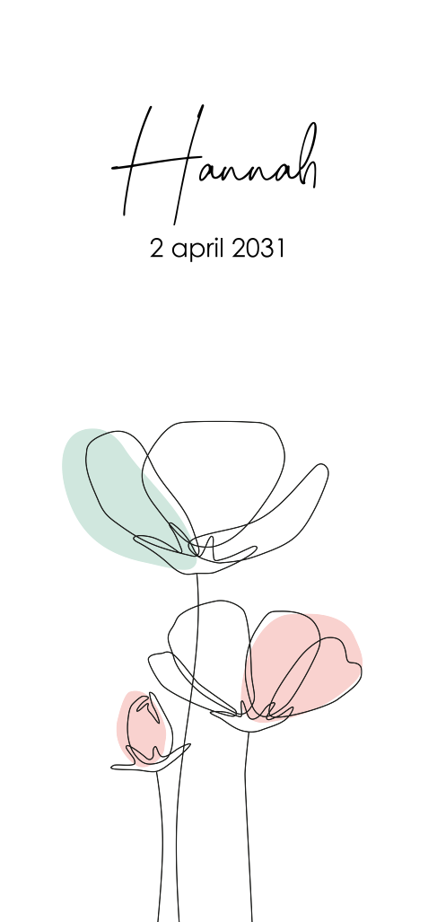 Dit lieve geboortekaartje met geïllustreerde bloemen is eenvoudig, de vlak kleuren van de bloemetjes geven een vrolijk effect. Het kaartje is aan te passen in onze online editor.