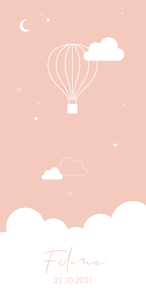 Dit is een lief geboortekaartje voor jullie dochtertje. Op het kaartje zijn een luchtballon, wolkjes en sterren te zien tegen een roze achtergrond. Pas het kaartje naar wens aan in onze online editor en bestel een proefdruk om dit kaartje in het echt te zien!