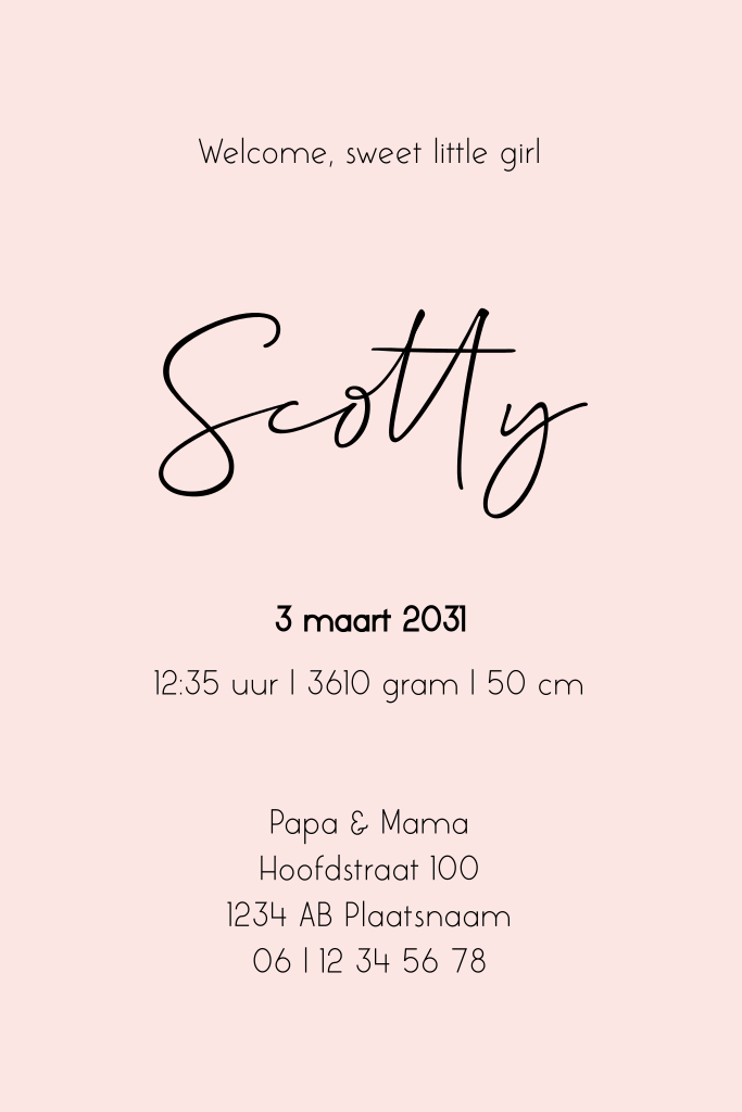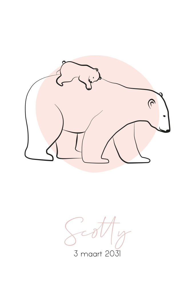 Dit is een lief geboortekaartje voor jullie dochter. Centraal op het kaartje staat een roze vlak met de lijntekening van twee beertjes. Pas het kaartje naar wens aan in onze online editor en bestel snel een proefdruk om dit kaartje in het echt te zien!