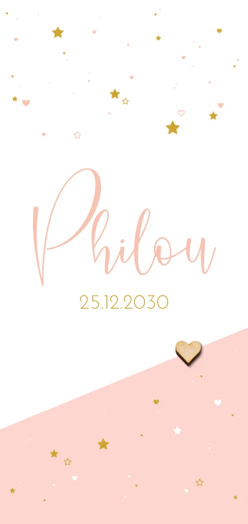 Stoere geboortekaart voor de geboorte van je dochtertje met sterretjes en hartjes op wit en een peach kleurig geometrisch vlak. Het echt houten hartje maakt dit kaartje helemaal af!