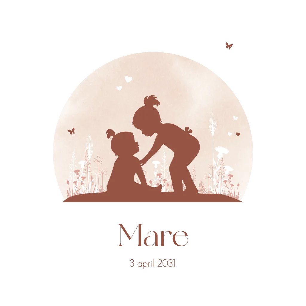 Kondig de geboorte van jullie dochter en zusje aan met dit kaartje! Op het kaartje zijn de silhouetjes van een grote zus met haar kleine zusje te zien. Het kaartje kan naar wens aangepast worden in onze online editor.
