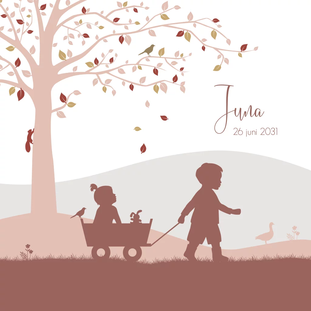 Een lief geboortekaartje voor de geboorte van een meisje. Jullie kindjes worden afgebeeld als silhouetjes. Jullie oudste zoon trekt de bolderkar met daarin jullie jongste dochtertje. Pas het kaartje naar wens aan in onze online editor.