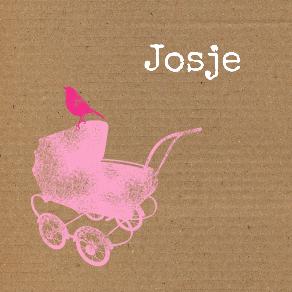 Hip geboortekaartje met vogeltje op hippe ouderwetse kinderwagen met kartonnen achtergrond. Pas de kleuren van de letters en de vogels en kinderwagen zelf aan.