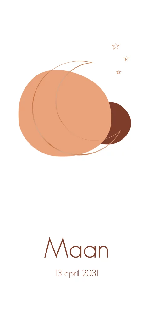 Dit is een mooi geboortekaartje voor jullie dochter. Op twee cirkels in aardetinten wordt een maan in hoogglans gedrukt. Ook drie kleine sterretjes worden gedrukt in hoogglans. Het kaartje kan naar wens aangepast worden in onze online editor.