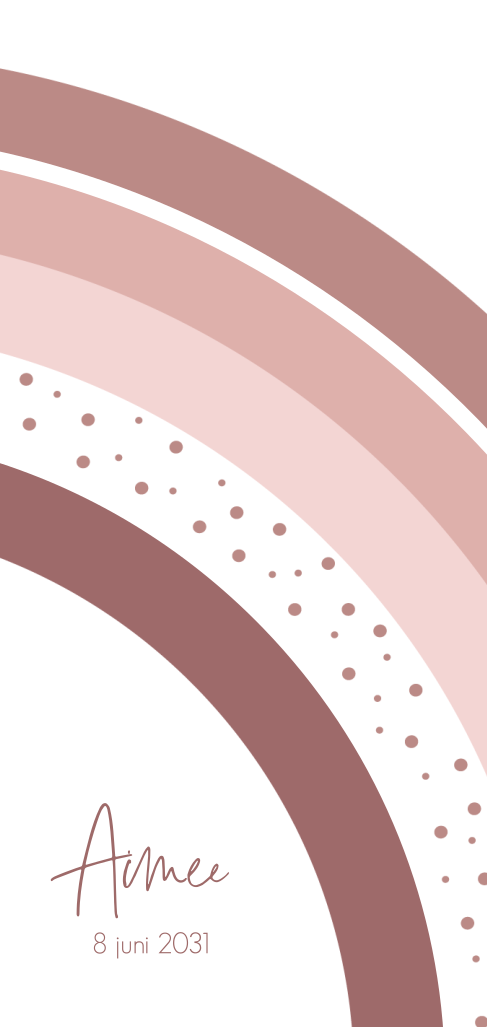 Een langwerpig geboortekaartje voor de geboorte van jullie dochtertje. Het kaartje heeft een vrolijke regenboog in verschillende kleuren roze en lijntjes die in roségoudfolie worden gedrukt. De binnenkant van het kaartje heeft een oudroze kleur waar de naam van jullie kleintje ook in roségoudfolie wordt gedrukt. In onze online editor kan je makkelijk en snel de naam of het kaartje aanpassen naar je eigen wensen.