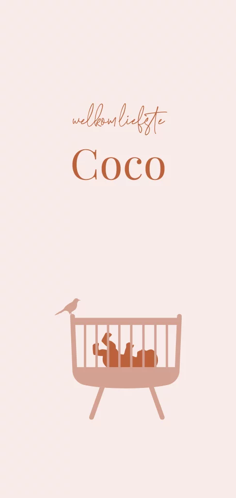Een schattig langwerpig geboortekaartje voor een meisje. Het kaartje heeft een zacht roze achtergrond met daarop een silhouetje van een baby in wiegje. Pas het ontwerp naar wens zelf aan.