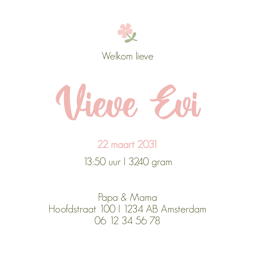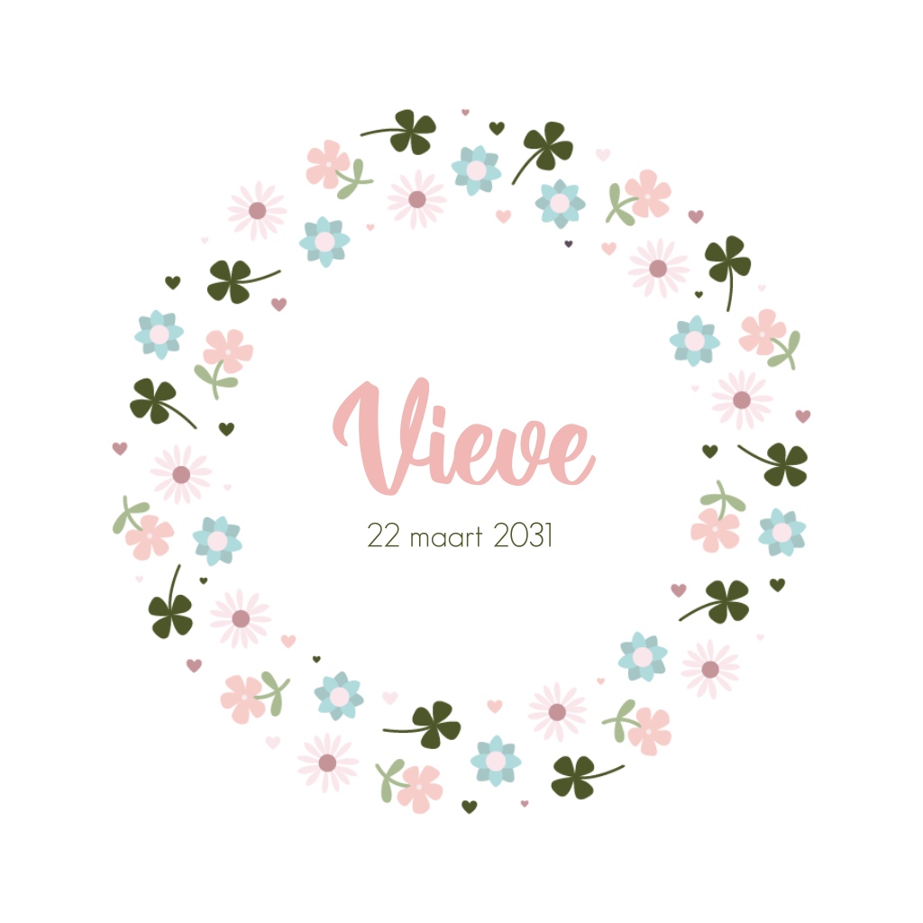 Lief dubbel geboortekaartje voor een meisje met een bloemencirkel. Het is een vrolijk kaartje voor jullie toekomstige dochtertje. Pas het kaartje naar wens aan in onze online editor.