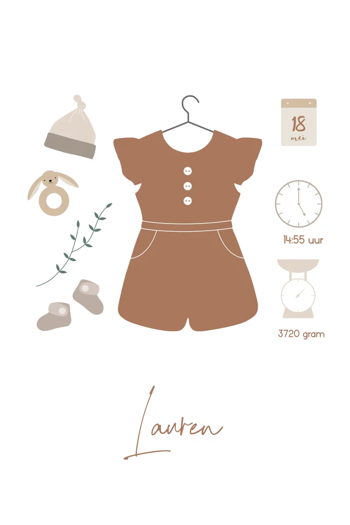 Een lief geboortekaartje voor jouw meisje. Het kaartje heeft illustraties van verschillende babykleertjes. Daarnaast zie je een deel van de geboortegegevens. Pas het kaartje naar wens aan in onze online editor.