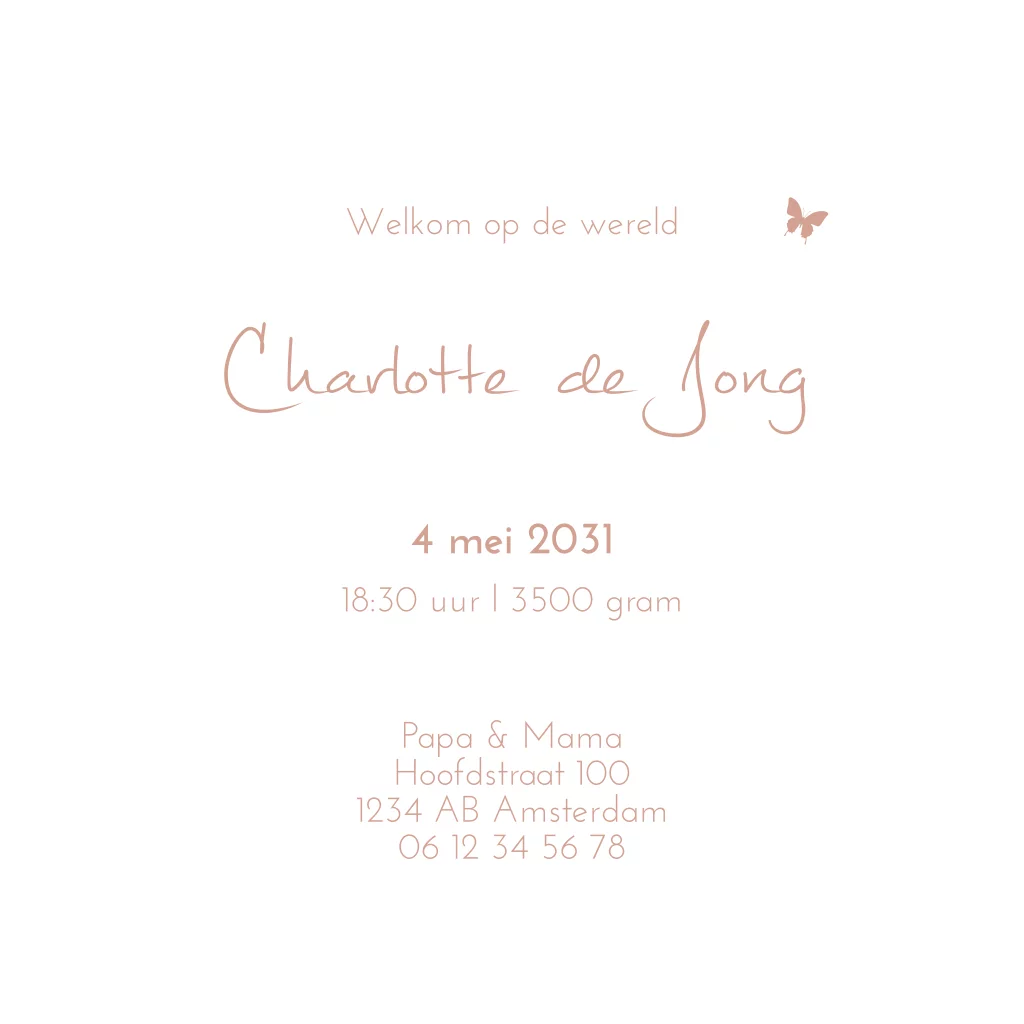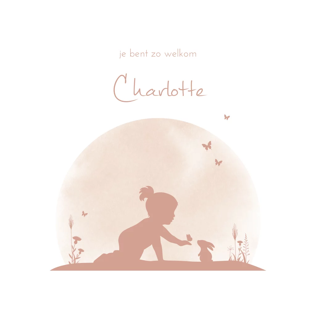 Wat een lief geboortekaartje voor jouw kindje! Het kaartje heeft een witte basis met daarop een oudroze silhouetje van een meisje met konijntje en vlinder. Op de achtergrond zie je een watercolour cirkel. Pas het ontwerp naar wens aan in onze online editor.
