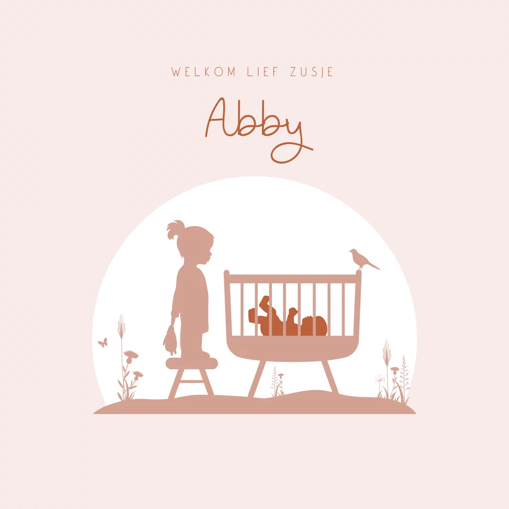 Een lief geboortekaartje voor jouw kindje. Het kaartje heeft een roze achtergrond met daarop een silhouetje van een grote zus bij het wiegje van haar kleine baby zusje. Het wiegje staat tussen de bloemen in het gras. Pas het ontwerp naar wens zelf aan.