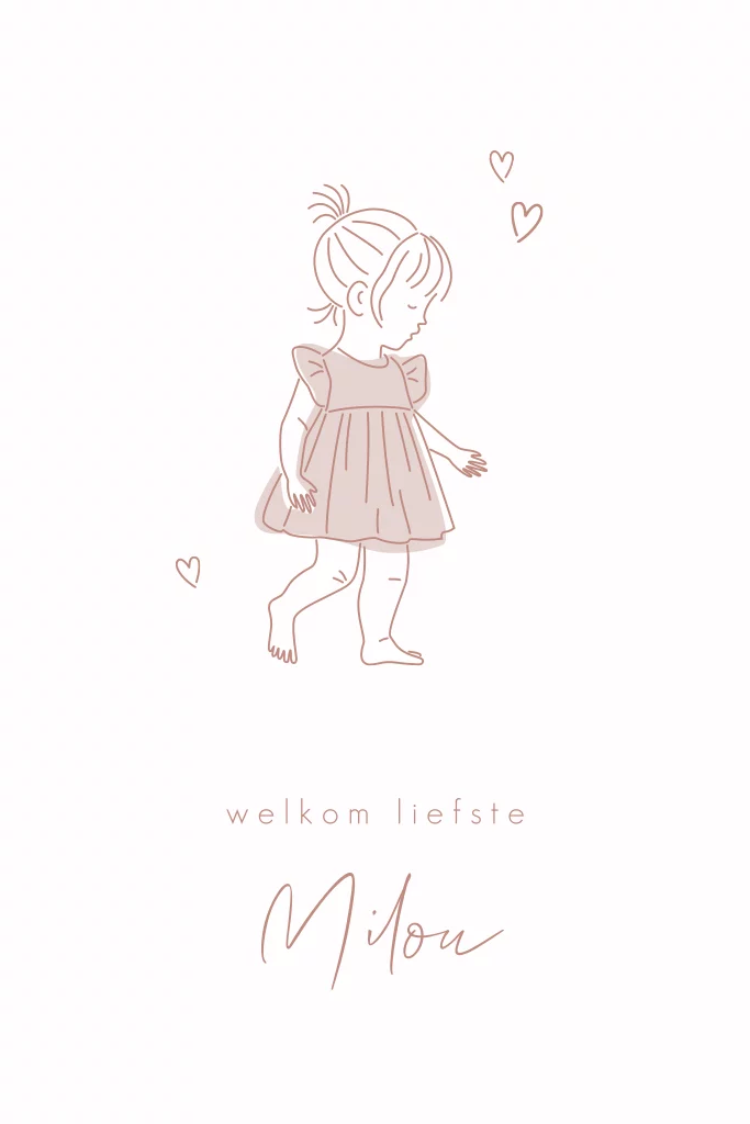 Schattig geboortekaartje voor jullie dochter. Op het staande kaartje in oudroze staat een lijntekening van een meisje met kleine hartjes. Pas het kaartje naar wens aan in onze online editor. Bestel snel een proefdruk om dit kaartje in het echt te bewonderen!