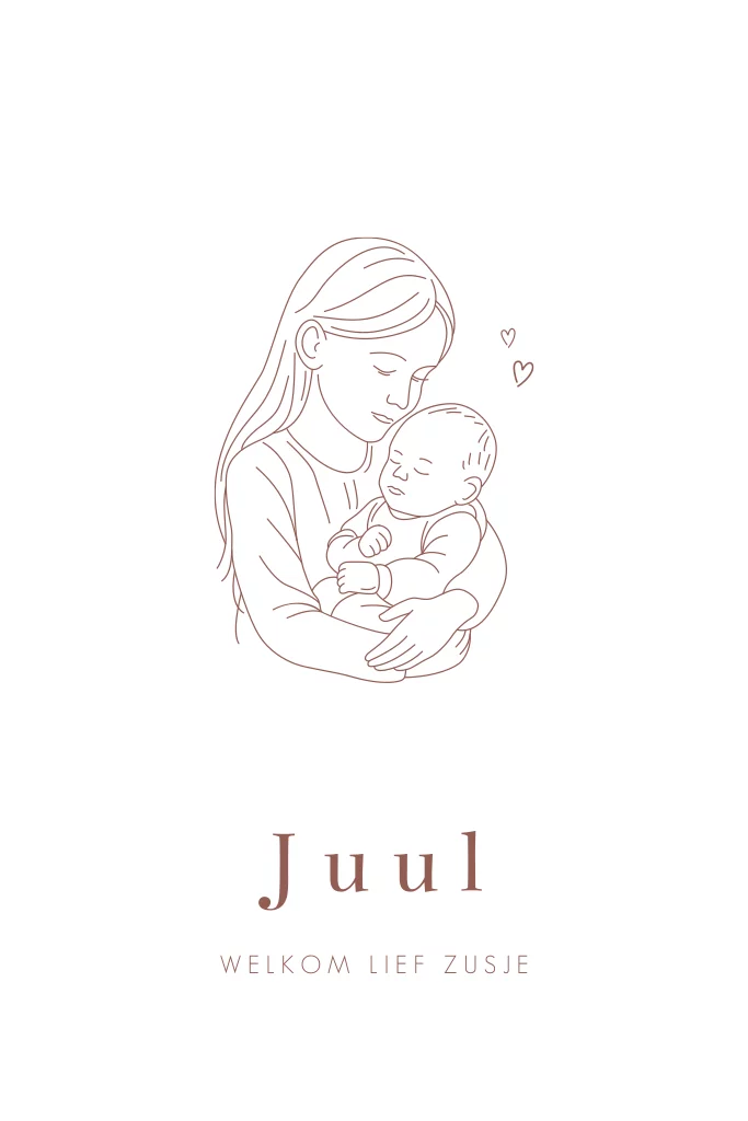Een stijlvol en lief geboortekaartje voor een tweede kindje. Het kaartje heeft een lijntekening van een grote zus met haar kleine zusje. Pas het ontwerp naar wens zelf aan.