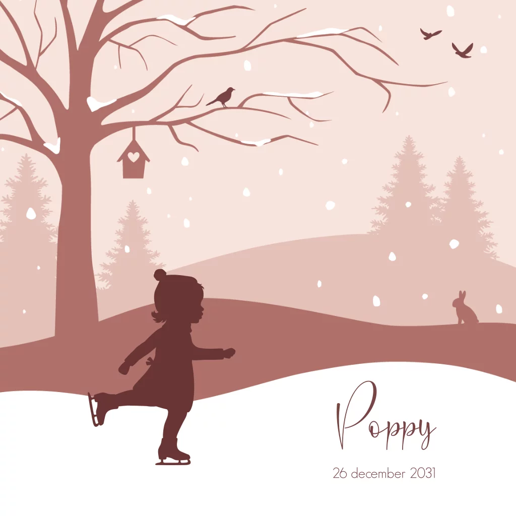 Winters geboortekaartje met silhouet van een schaatsend meisje