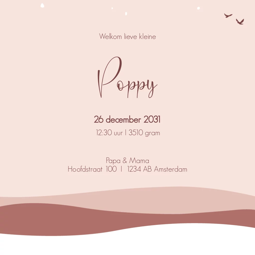 Kondig de geboorte van jullie dochter aan met dit lieve kaartje. In een winters landschap is een meisje aan het schaatsen. Het kaartje kan helemaal naar wens aangepast worden in onze online editor.