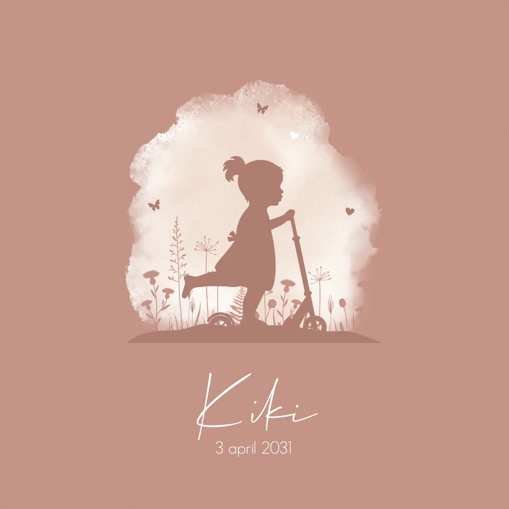 Dit is een mooi kaartje om de geboorte van je dochter mee aan te kondigen. Op een watercolour achtergrond is het silhouet van een meisje op een step te zien. De vlinders geven dit kaartje een extra lieve uitstraling. Pas het kaartje naar wens aan in onze online editor.